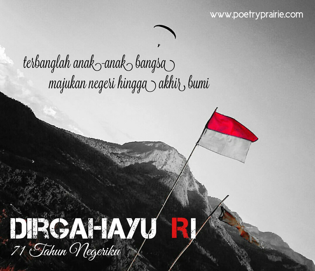 Dirgahayu RI poetryprairieAugust 17, 2016August 17, 2016Poetry Post navigation PreviousNext Share this: Click to share on X (Opens in new window) X Click to share on Facebook (Opens in new window) Facebook Click to email a link to a friend (Opens in new window) Email Like Loading... Related