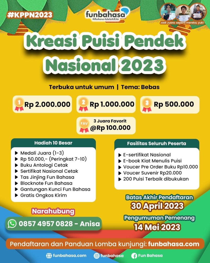 Mari tuangkan perasaan kita melalui puisi dengan mengikuti Kreasi Puisi Pendek Nasional 2023 dari Fun Bahasa.