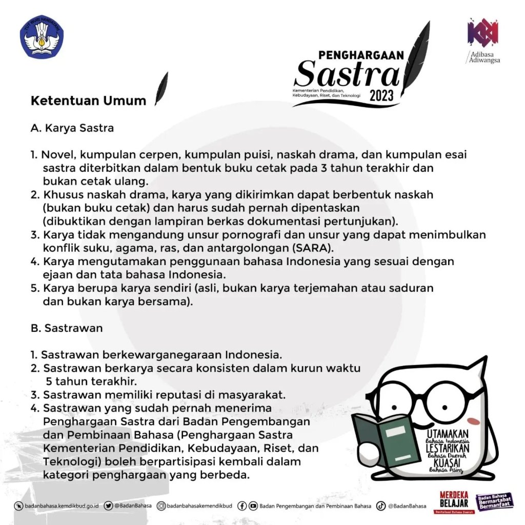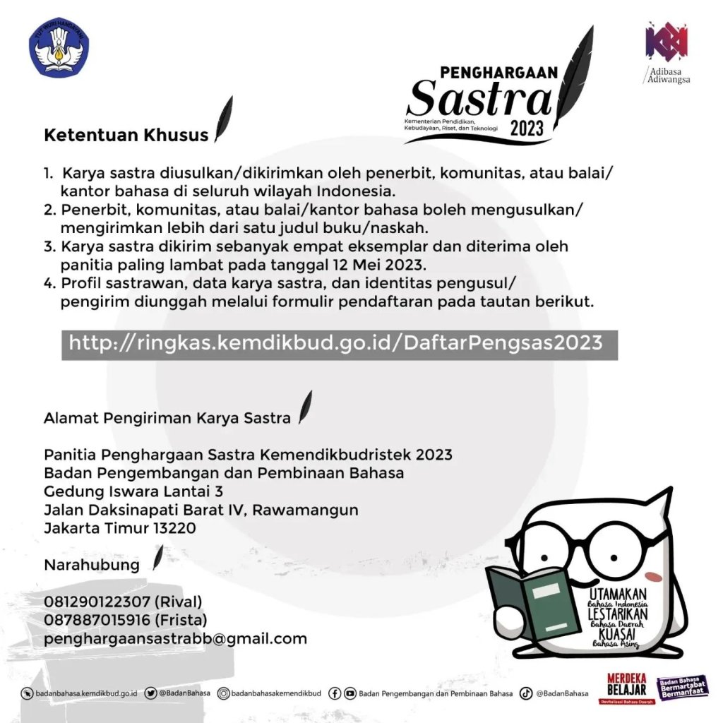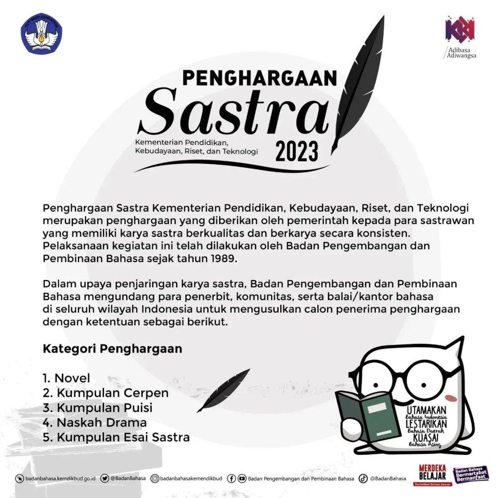 Dalam upaya penjaringan karya sastra, Badan Pengembangan dan Pembinaan Bahasa mengundang para penerbit, komunitas, serta balai/kantor bahasa di seluruh wilayah Indonesia untuk mengusulkan calon penerima penghargaan sastra dengan mengisi formulir pendaftaran pada tautan berikut.