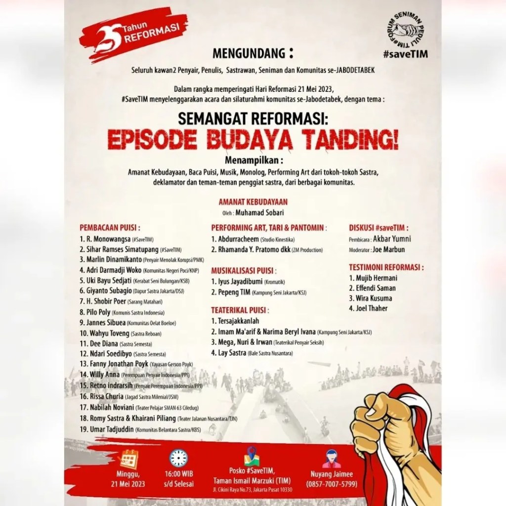 Dalam rangka memperingati Hari Reformasi 21 Mei 2023, #SaveTIM kembali menyelenggarakan acara dan silaturahmi komunitas se-Jabodetabek, dg tema :