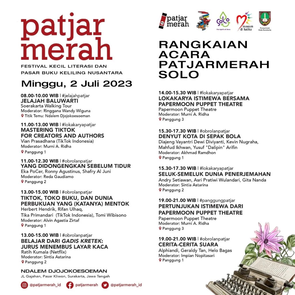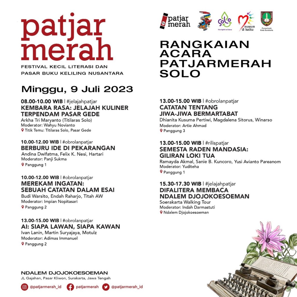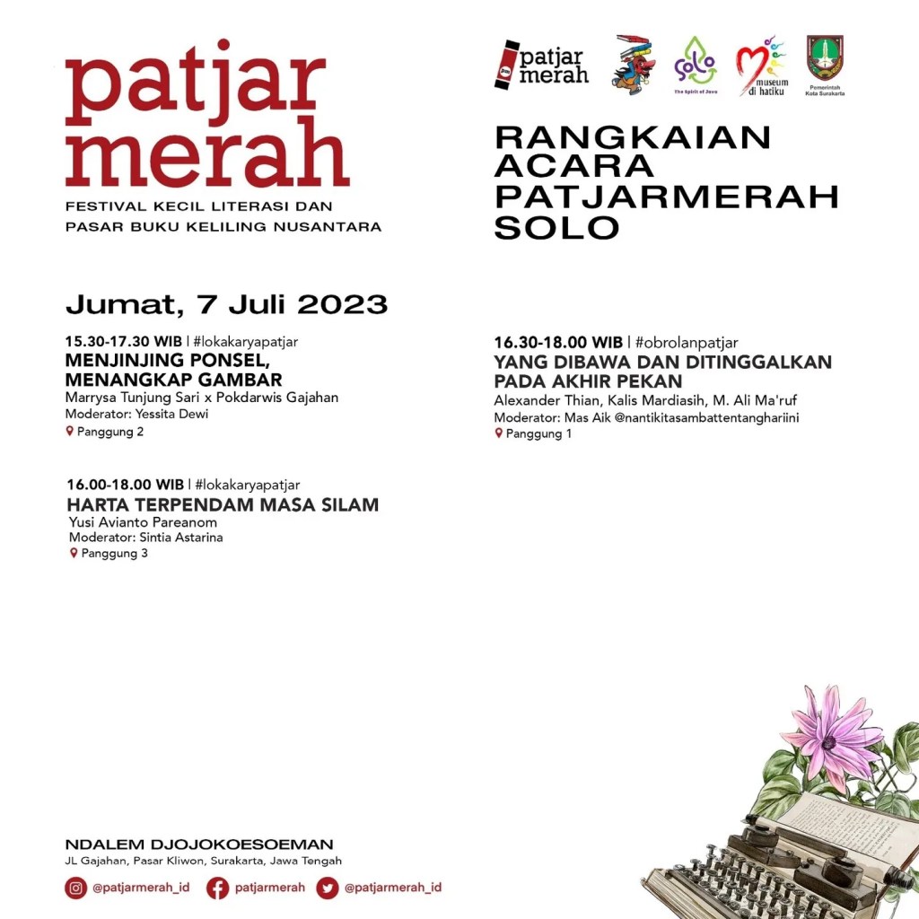 Siapa yang sudah tidak sabar menunggu pengumuman ada apa saja di patjarmerah Solo? Inilah rangkaian acara selama sembilan hari patjarmerah Solo, dirancang untuk merasakan dan merespons denyut kota, manusia, dan segala kegiatan di dunia literasi.