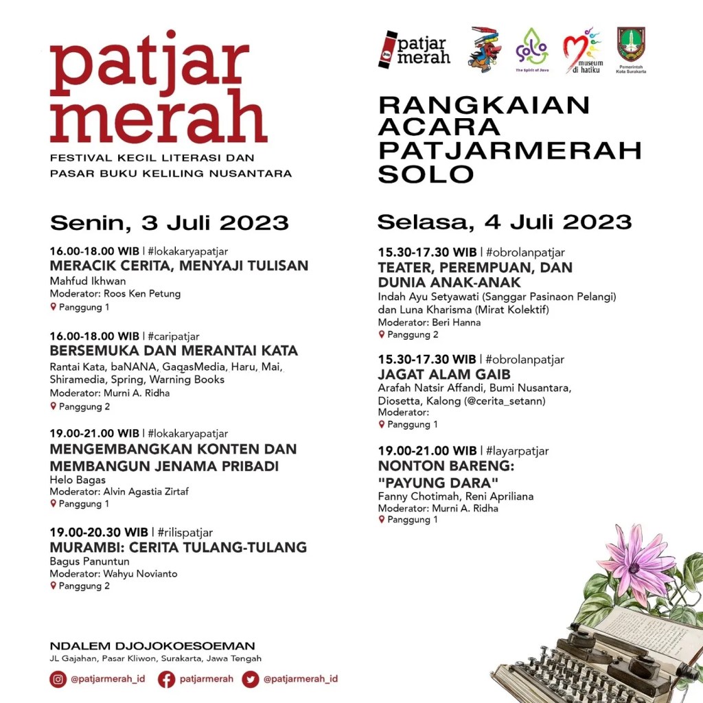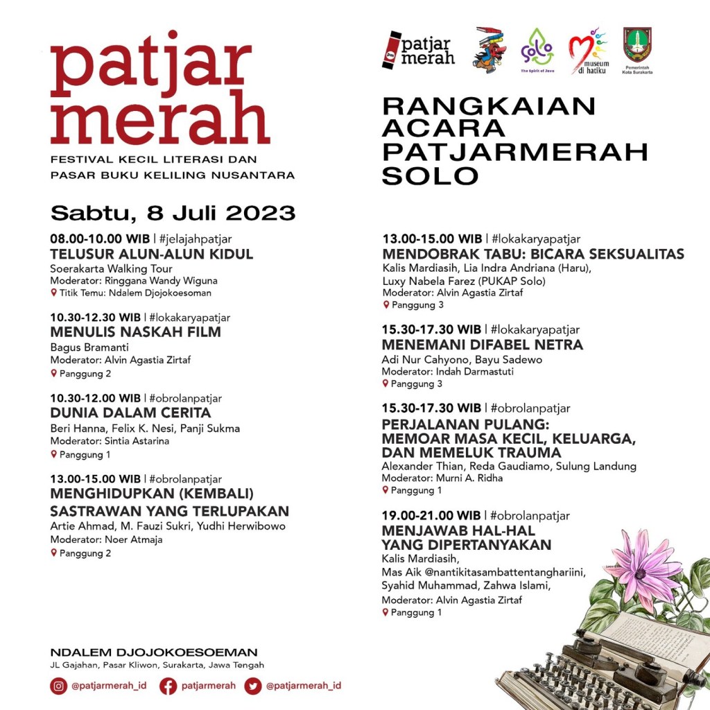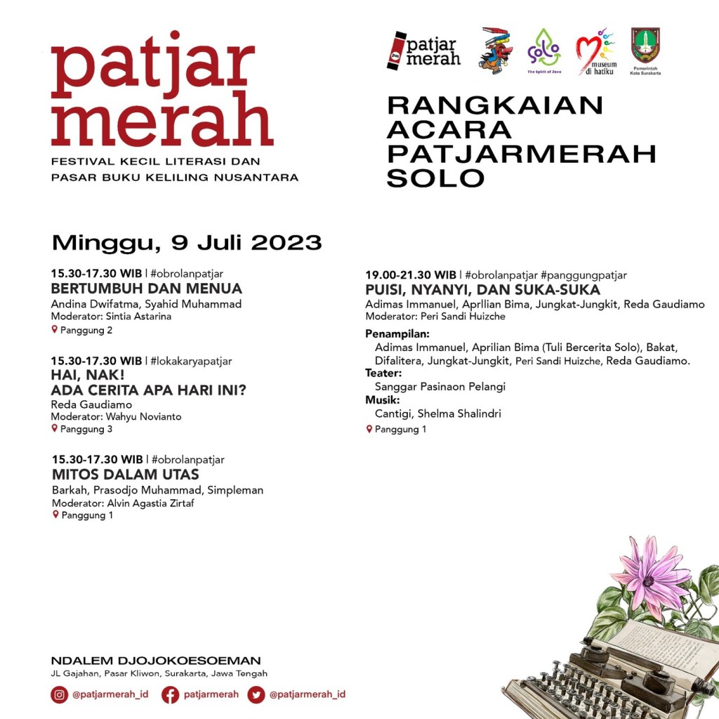 Siapa yang sudah tidak sabar menunggu pengumuman ada apa saja di patjarmerah Solo? Inilah rangkaian acara selama sembilan hari patjarmerah Solo, dirancang untuk merasakan dan merespons denyut kota, manusia, dan segala kegiatan di dunia literasi.