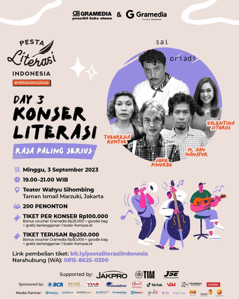 #PestaLiterasiIndonesia pada 2023 ini dimeriahkan lebih dari 30 penulis, penyair, pegiat kuliner, musisi, dan tokoh yang akan hadir dalam berbagai panel diskusi, kelas, kompetisi, serta konser literasi.