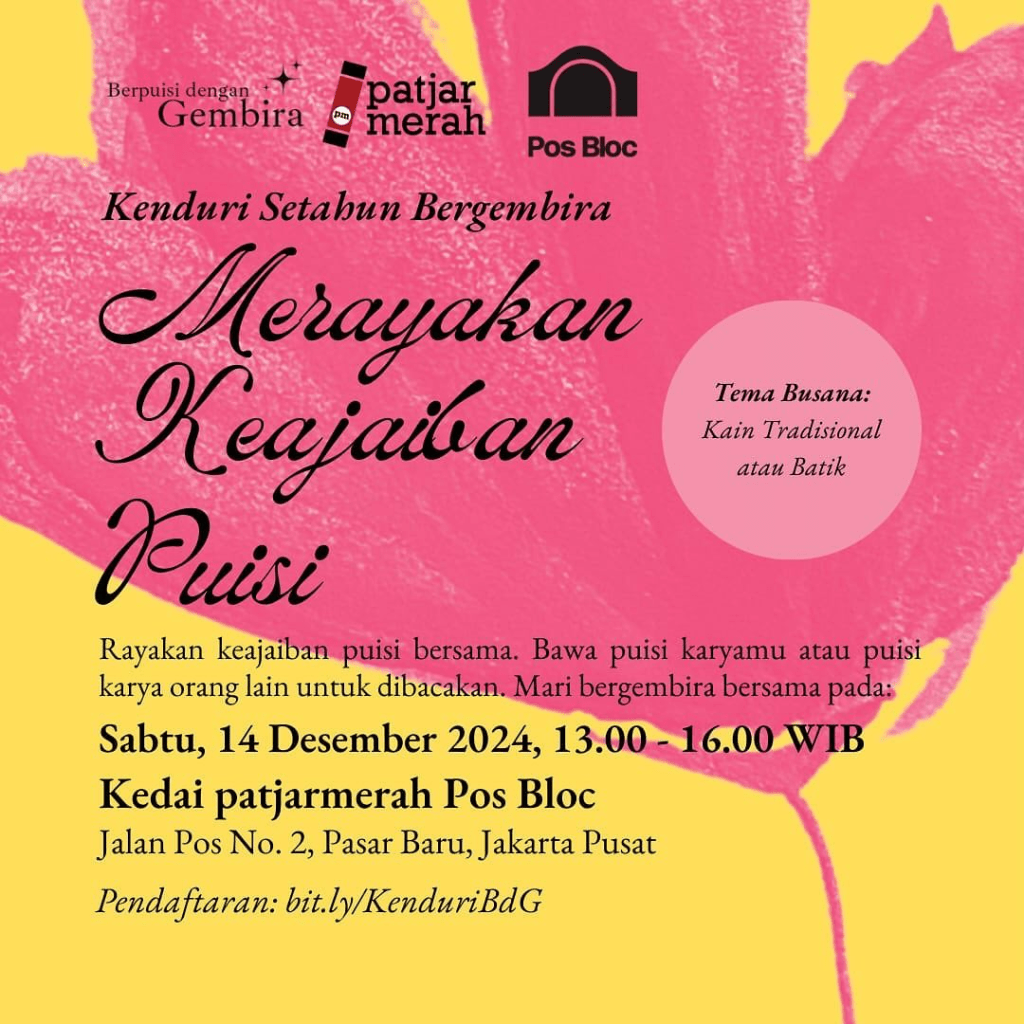 Datang dan rayakan keajaiban puisi di Kedai @patjarmerah_id Pos Bloc hari Sabtu, 14 Desember 2024 pukul 1 siang.
