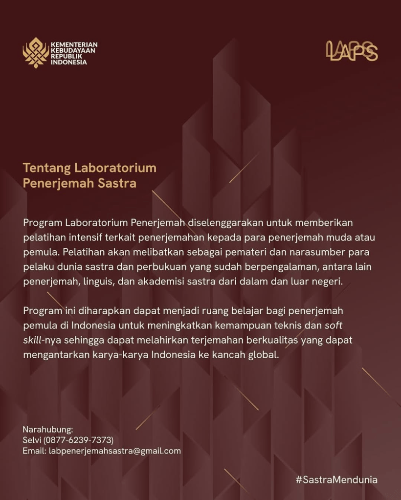Kementerian Kebudayaan mengundang teman-teman penerjemah di seluruh Indonesia untuk mengikuti pelatihan intensif Program Laboratorium Penerjemahan Sastra. Kegiatan ini akan melibatkan pemateri dan narasumber para pelaku dunia sastra dan perbukuan, antara lain penerjemah, linguis, dan akademisi sastra dari dalam dan luar negeri.