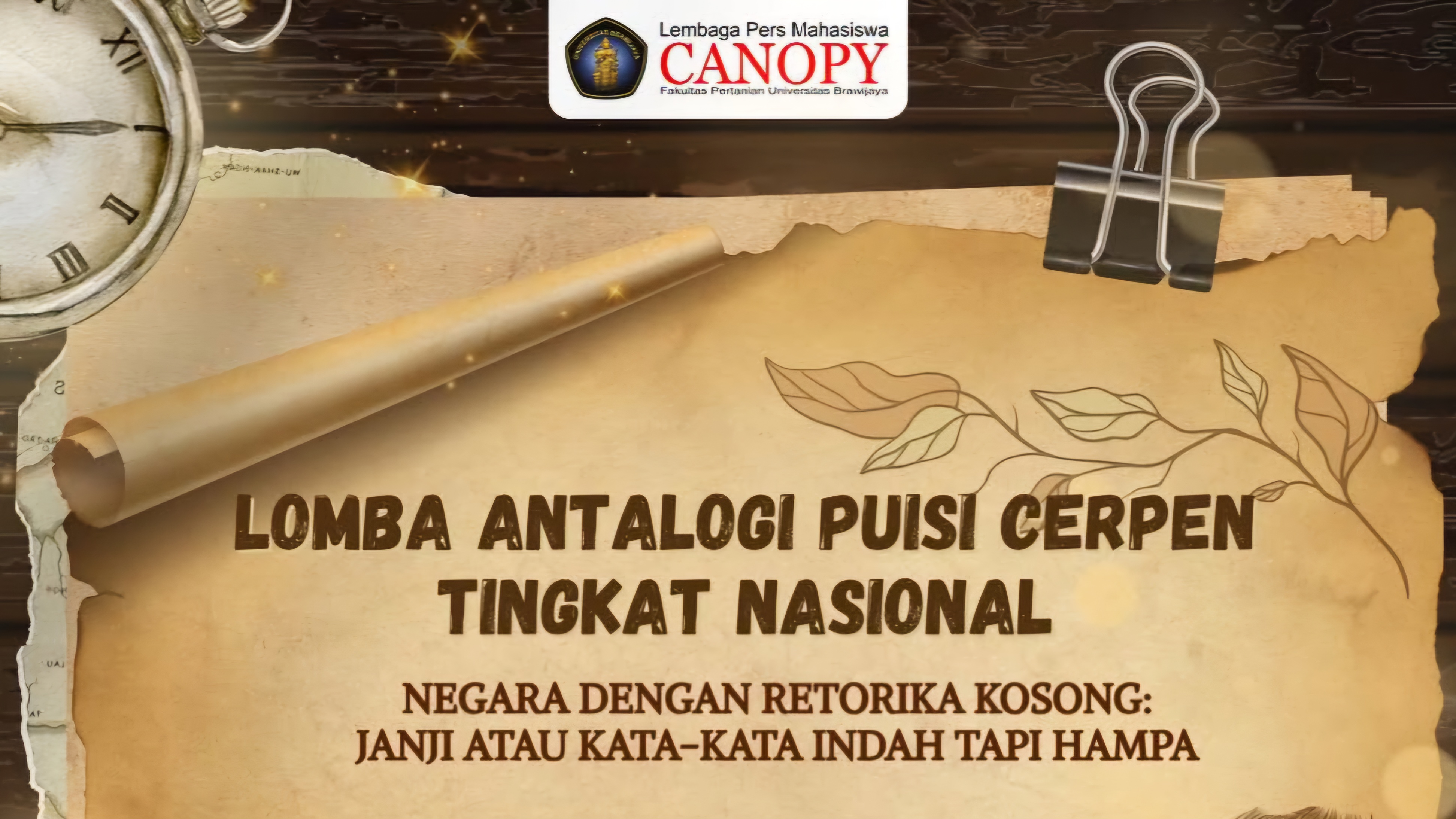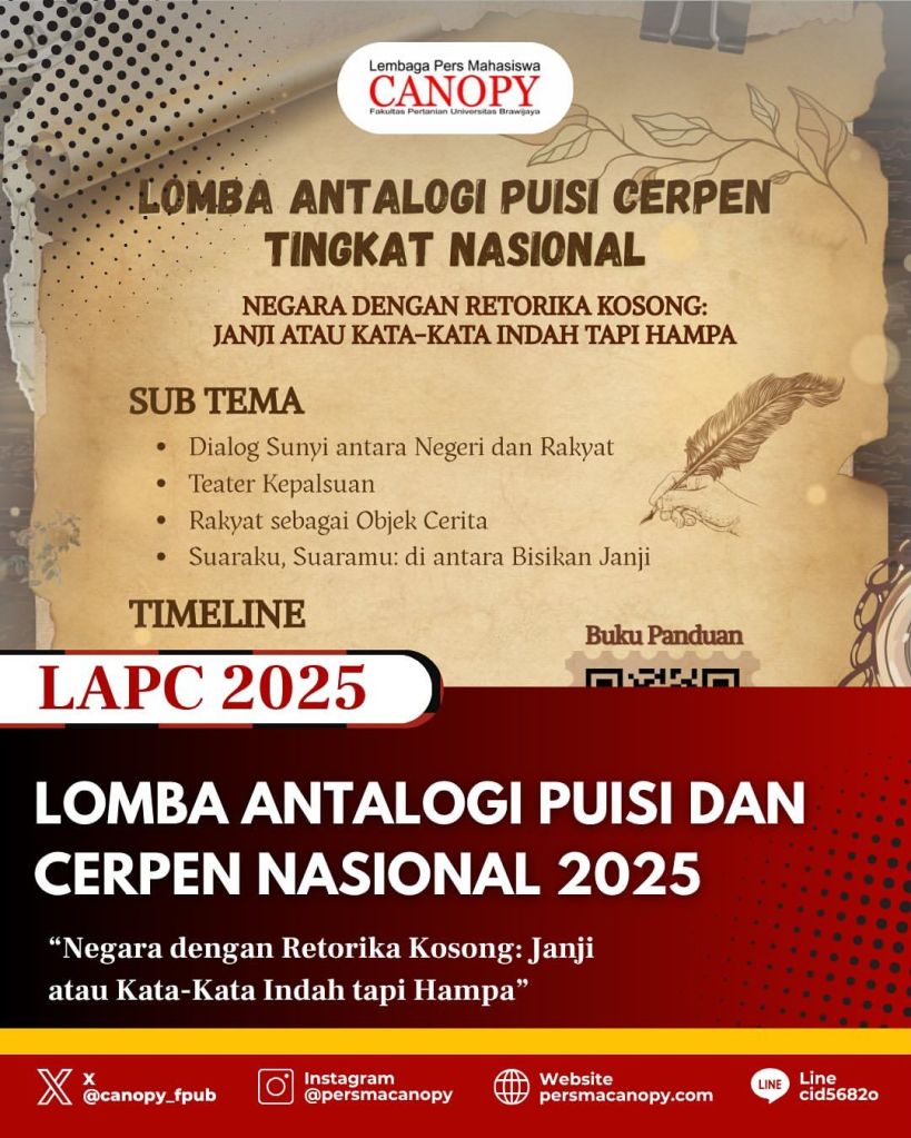 Lomba Antologi Puisi dan Cerpen kembali hadir pada tahun 2025 dengan membawakan tema “Negara dengan Retorika Kosong: Janji atau Kata-Kata Indah Tapi Hampa“, serta empat sub tema, yaitu: