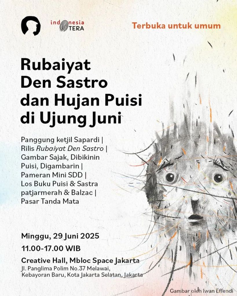 Terbuka untuk umum, siapa pun boleh turut mengenal Rubaiyat Den Sastro dan bermain hujan puisi di ujung Juni ini.