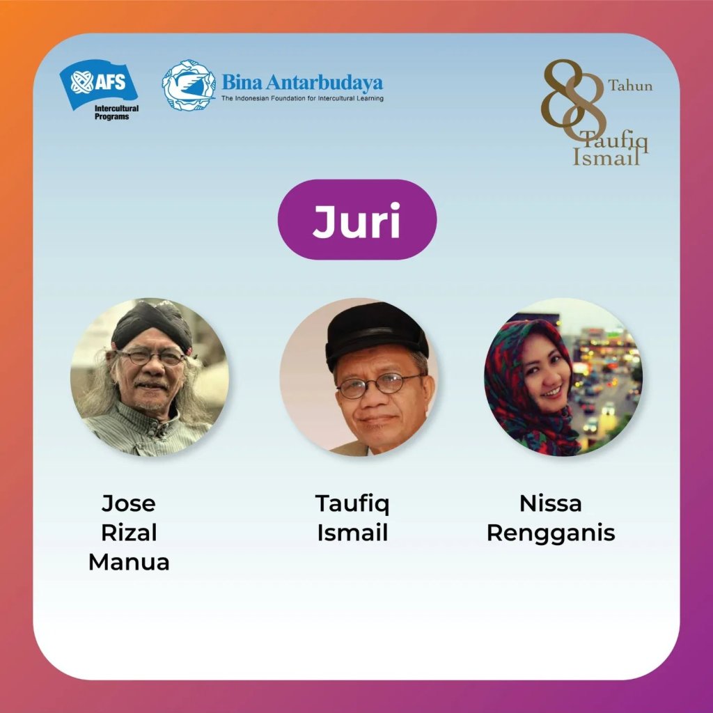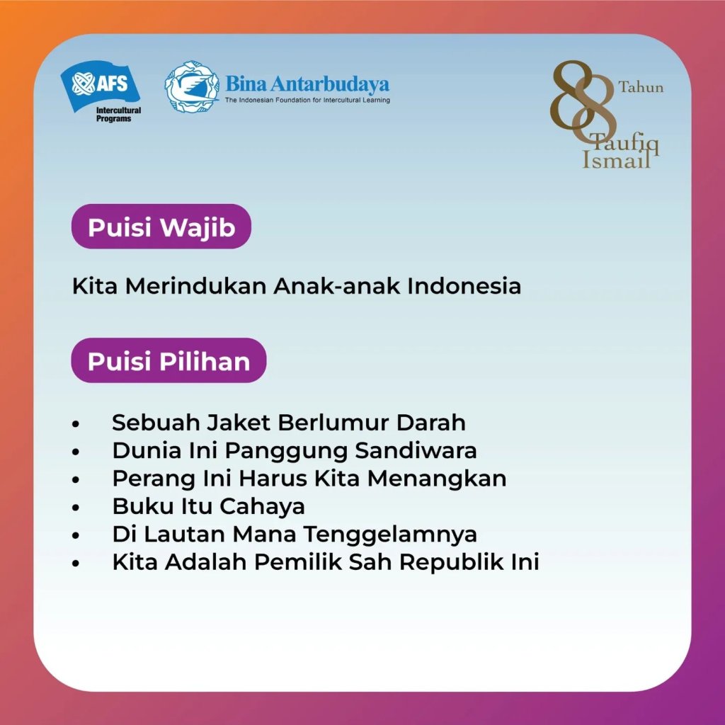 Tahun ini Bina Antarbudaya mengadakan sebuah kegiatan seni sastra “Lomba Puisi Karya Taufiq Ismail 2023” dengan mengajak seluruh Siswa SMA di Indonesia untuk unjuk kebisaan dalam membacakan puisi karya Taufiq Ismail.