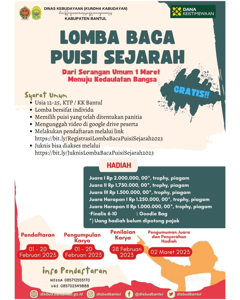Tahun ini, Dinas Kebudayaan (Kundha Kabudayan) Kabupaten Bantul menyelenggarakan Lomba Baca Puisi Sejarah yang bertema “Dari Serangan Umum 1 Maret Menuju Kedaulatan Bangsa”. Lomba bersifat individu serta memperebutkan hadiah thropy, piagam dan uang pembinaan lho. Tunggu apa lagi? Pendaftarannya mulai tanggal 1-20 Februari 2023 ya.