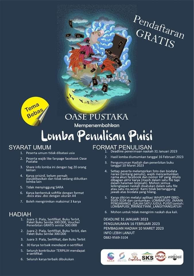 5. Karya dikirim melalui aplikasi WHATSAPP 0882-9569-3104 dan cantumkan: LOMBAPUISI_(NAMA PENGARANG)_(SALAH SATU JUDUL PUISI)