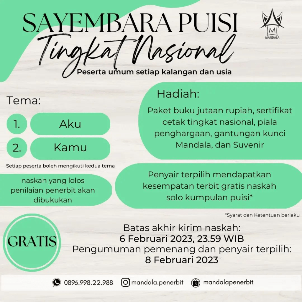 Mandala Penerbit menyajikan sayembara puisi dua tema kembali untuk periode ketiga di 2023, yaitu: Aku dan Kamu