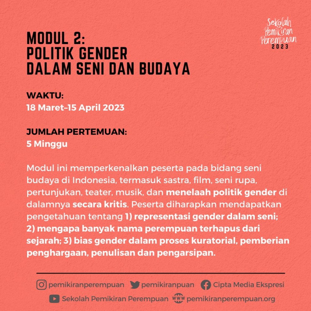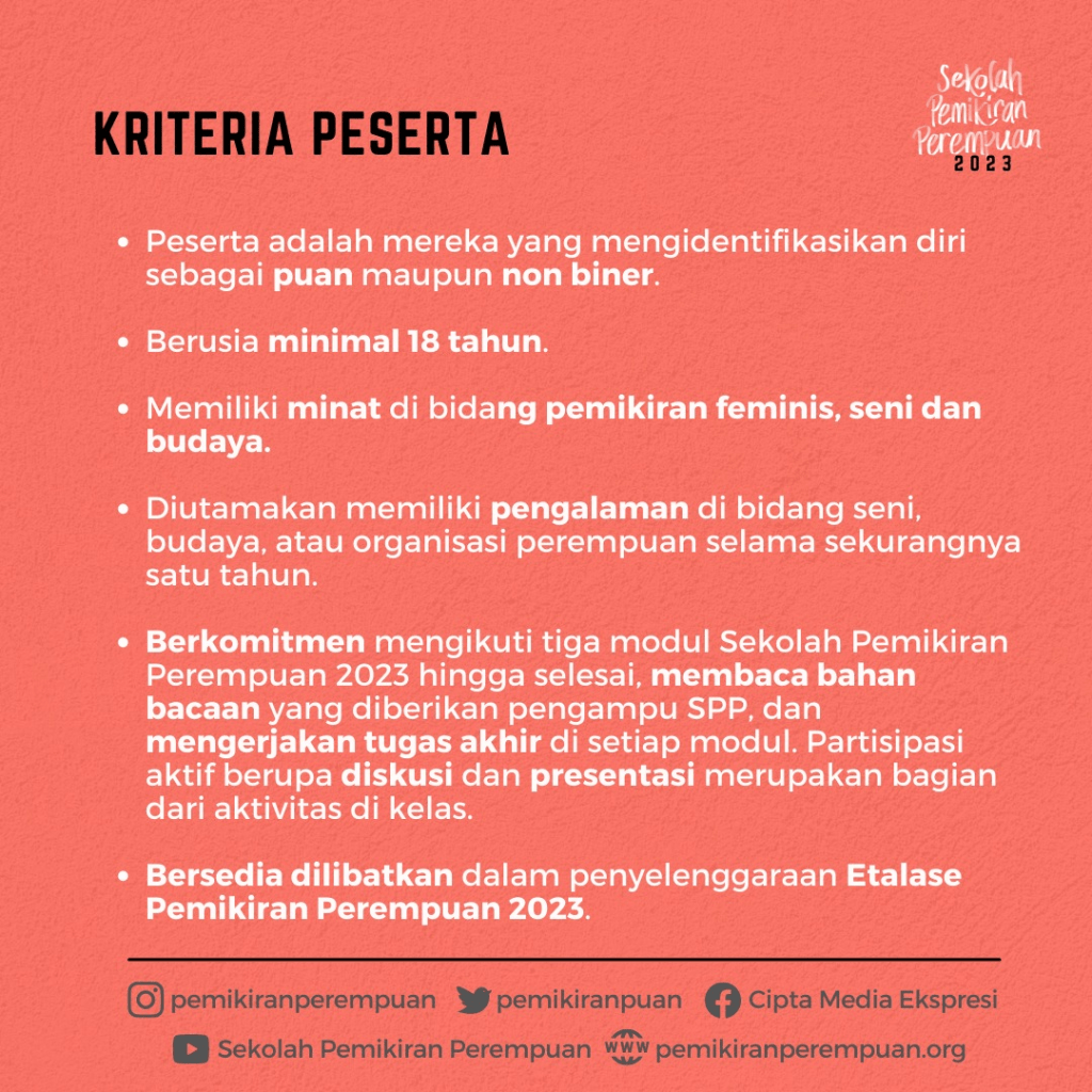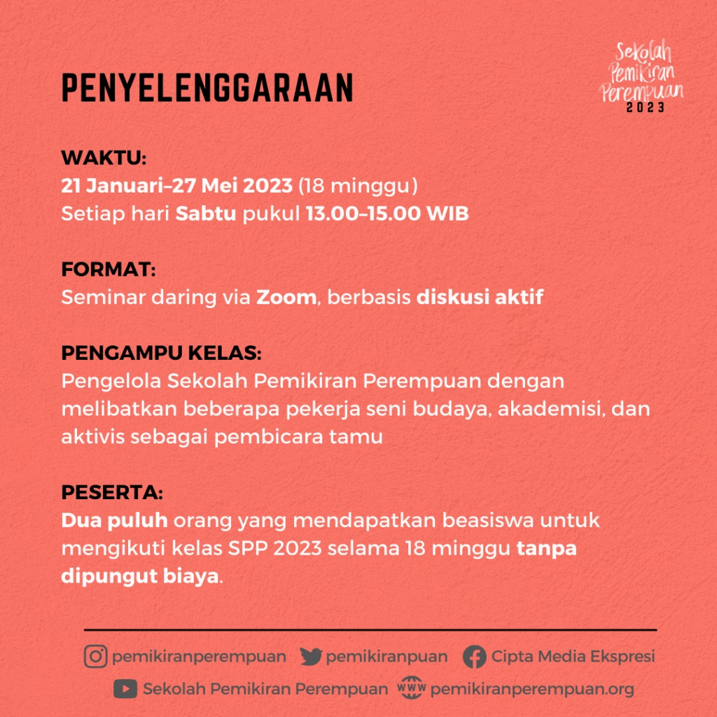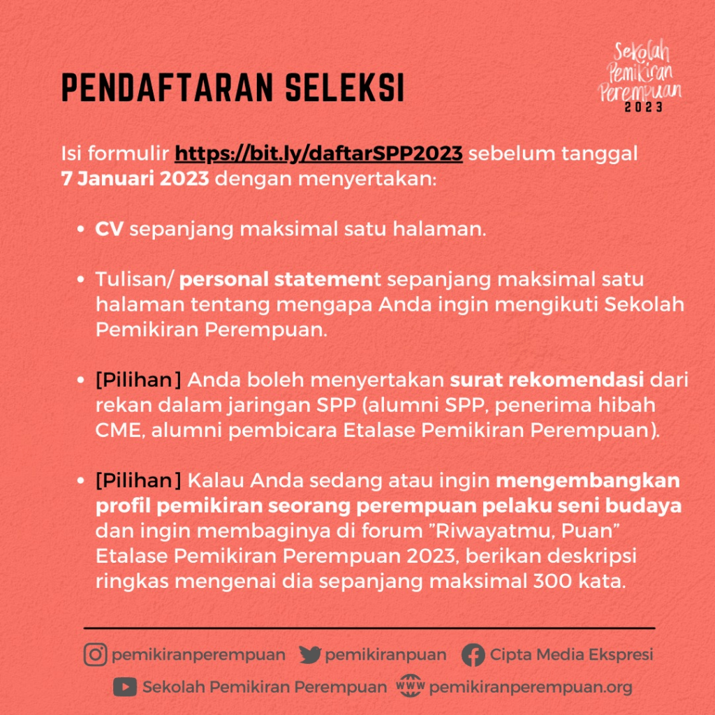 Cipta Media Ekspresi membuka kesempatan bagi rekan-rekan untuk mengajukan aplikasi beasiswa mengikuti Sekolah Pemikiran Perempuan 2023. Dua puluh puan akan menjadi peserta Sekolah Pemikiran Perempuan (SPP) yang berlangsung setiap Sabtu dari tanggal 21 Januari hingga 27 Mei 2023.