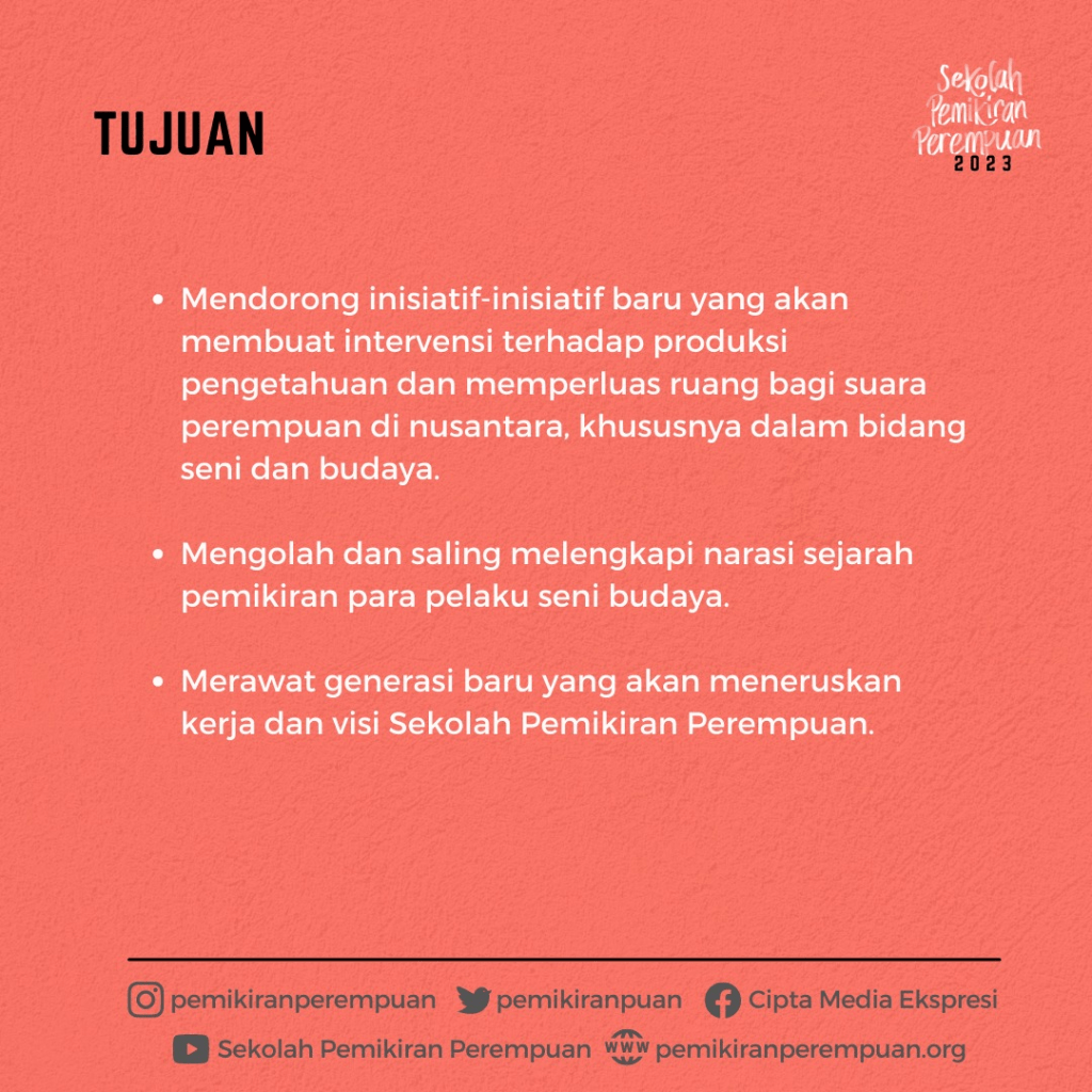 Sekolah Pemikiran Perempuan menyediakan ruang belajar informal bagi para puan, khususnya di bidang seni dan budaya, untuk mempelajari bersama pengetahuan dasar atas: pemikiran feminisme anti-kolonial dan pemikiran feminis di Indonesia, politik gender dalam seni budaya di Indonesia, serta pengorganisasian aktivisme kultural berperspektif feminis.