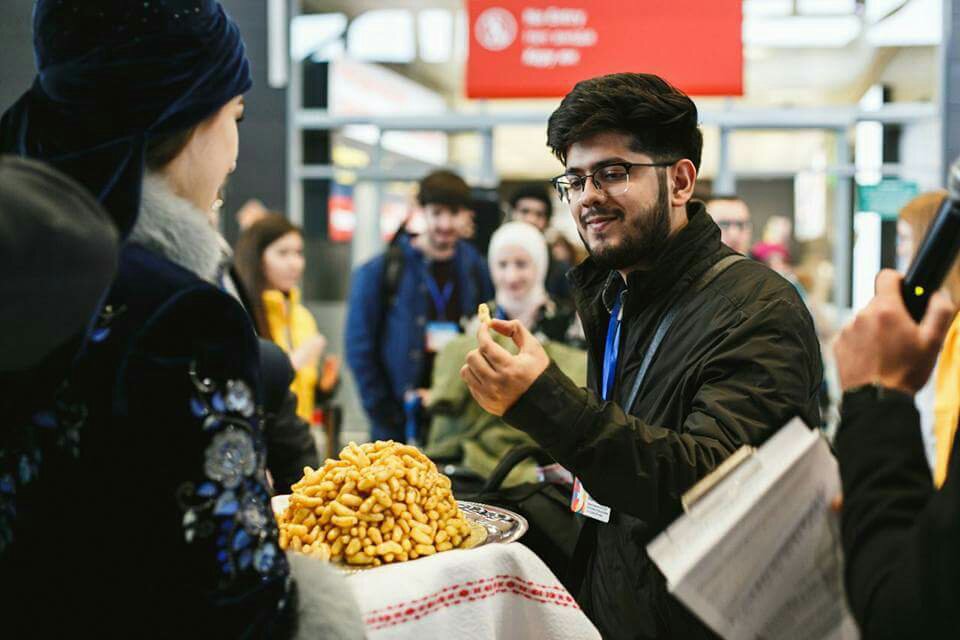 Di bandara internasional Kazan, peserta disambut dan disuguhi makanan nasional Tatarstan “Chak Chak”